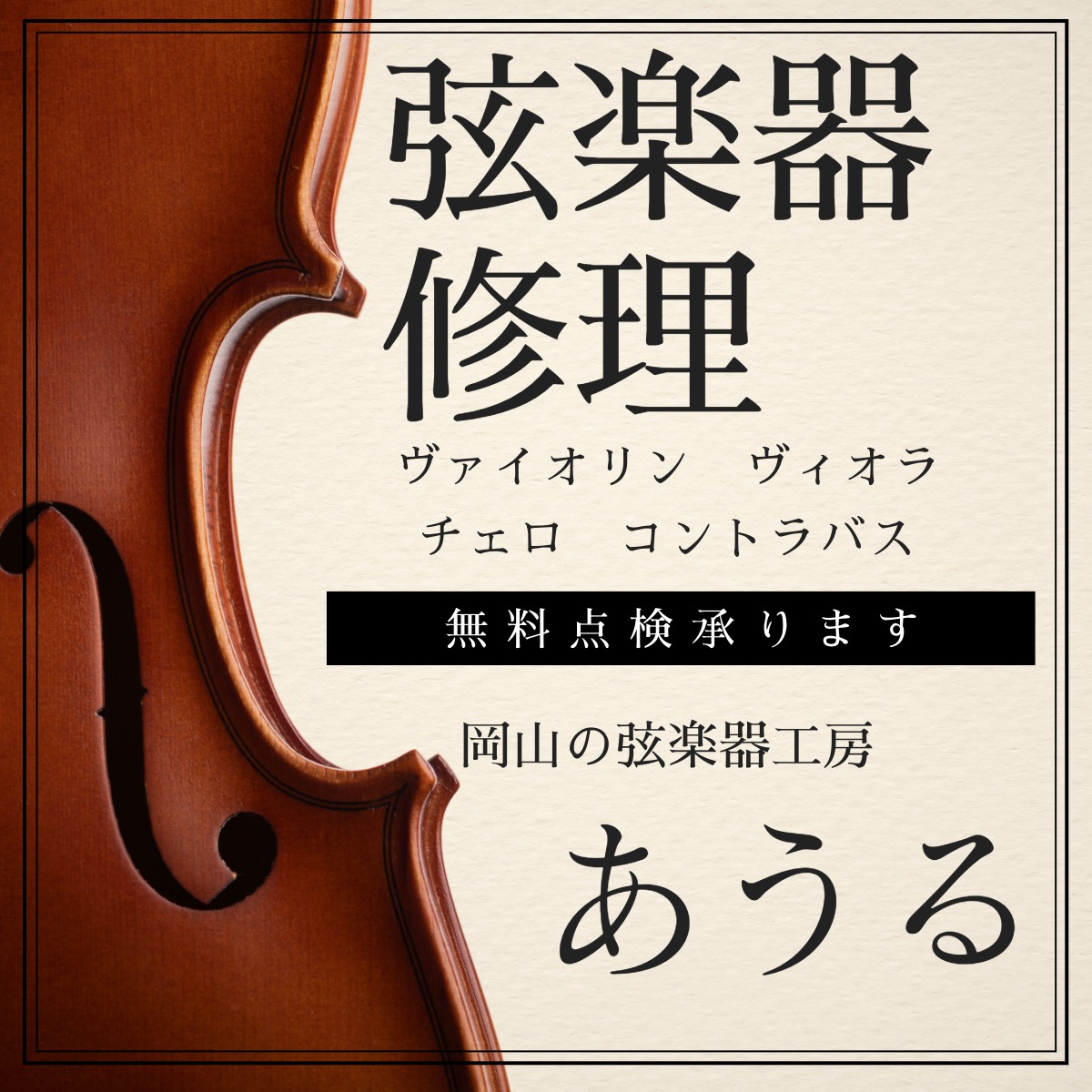 岡山県倉敷市にある、管楽器・弦楽器・ピアノの各技術者が対応する楽器修理専門店です。楽器修理のほか、中古楽器・リード・オイル・弦などの販売、弦楽器・ピアノのレンタル、楽器レッスンもございます。くらしき作陽大学、作陽高等学校に最も近い楽器店となりますので、学生の方もお気軽にご来店ください。